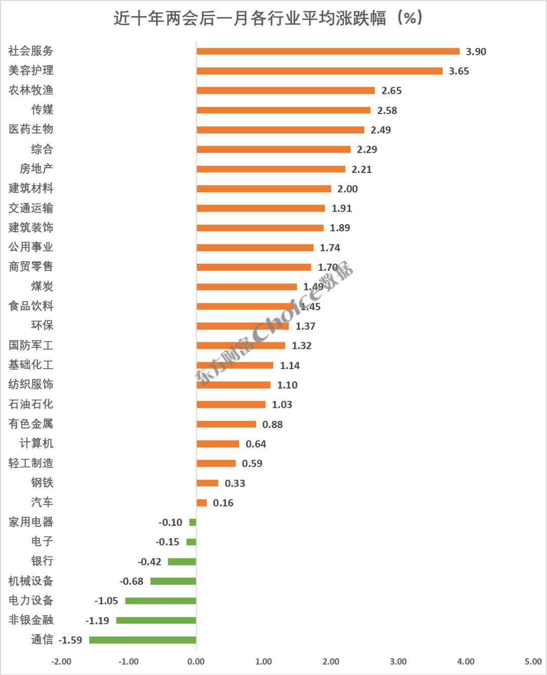 分行业来看,近十年31个申万一级行业中24个在两会后一个月平均涨幅为正。社会服务以3.9%的平均涨幅位居首位;紧随其后,美容护理平均涨幅为3.65%;农林牧渔、医药生物、房地产、传媒等行业涨幅超过2%。